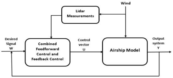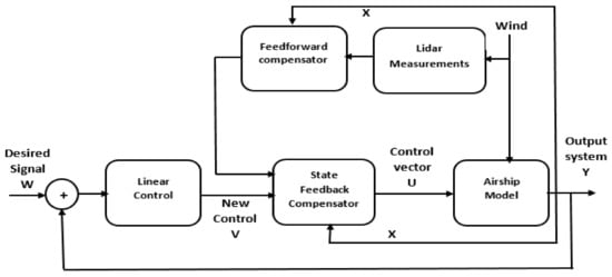 In some applications, exogenous perturbation is known in advance. This is often the case for the airship. The MC500 is equipped with LIDAR sensors that can measure the force of a wind gust. From the control point of view, the purpose of using this information is to reduce or minimize the influence of the disturbance that affects the airship. To deal with the problem of minimizing the impact of a wind gust, we propose the use of feedforward controls. This control vector is built using techniques of differential geometry. The diagram of this method is described in Figure 3.
