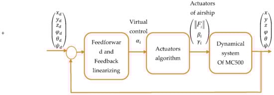 The total relative degree of the system is then r = 12, we conclude that the nonlinear model of the airship in Equation (11) satisfies the conditions in proposal 1. We can then deduce that the system in Equation (11) is feedback linearizable. Therefore, a state of feedback control and a diffeomorphism that transforms the nonlinear system into an equivalent linear system exist.