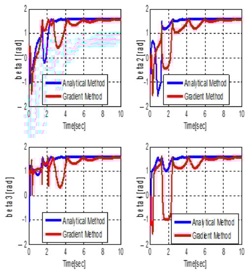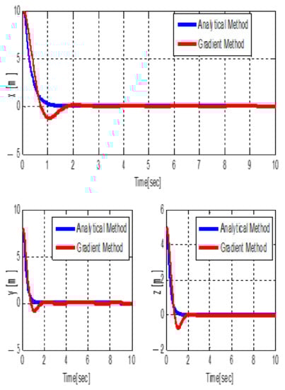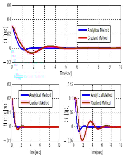 We can also see that the stabilization was carried out in a quick manner, less than 2 s for the analytical method, and between 4 and 10 s for the gradient method. This confirms the power of the analytic algorithm developed, not to mention the time saving CPU compared to that of the numerical method.