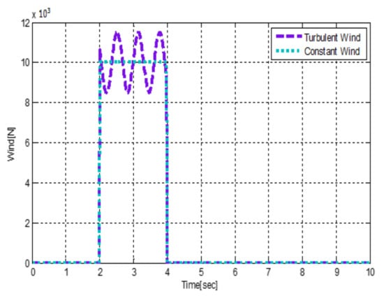 To make the experiment more realistic and to demonstrate the robustness of our algorithm, we have developed our control on the basis of a constant wind step with an intensity of 104 N, whereas, for the force applied to the airship, we allowed a sinusoidal variation of the wind intensity (see Figure 12). In spite of the relatively large difference between this applied force and the force on which the feedforward/feedback control was based, we note (in Figure 14) that our feedback control is efficient.