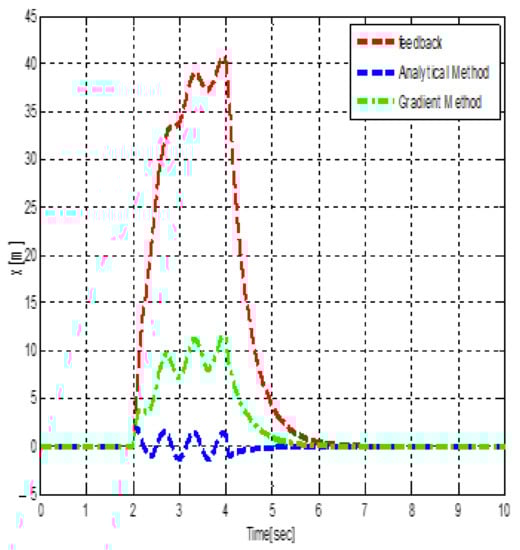It can be seen in Figure 13 that the airship is subject to a large drift with respect to its equilibrium position if it is subjected solely to feedback control (red dash). However, with the application of the feedforward/feedback control previously developed, the reduction of this drift is well demonstrated, especially in the case of the use of the analytical algorithm of transformation of the controls to the actuators (blue dash).