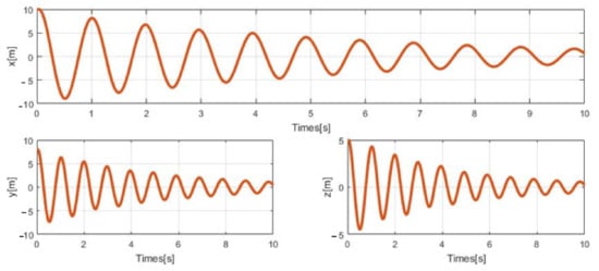 We can see in Figure 7 and Figure 8 that the control manages to stabilize the positions x0, y0, z0 and the angles ϕ, θ, ψ of the initial state Xe = [10; 8; 5; 0.3; 0.2; 0.1] to the desired state Xd = [0; 0; 0; 0; 0; 0].
