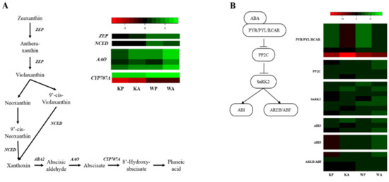 Based on our RNA-seq results, 28 unigenes (7 PYR/PYL/RCAR, 4 PP2C, 7 SnRK, 6 ABIs, and 4 ABF/AREBs) were annotated as ABA signaling related genes (Figure 2B). Among 7 genes encoding ABA receptors PYR/PYL/RCAR, 5 genes showed same expression patterns (differentially up-regulated in KP, WP, and WA, and down-regulated in KA). Most signaling pathways downstream of PYR/PYL/RCAR were differentially up-regulated, but ABI5s and one AREB/ABF were differentially down-regulated in KP. The detailed information and comparative expression value of ABA metabolic and signaling genes are shown in Table S9.