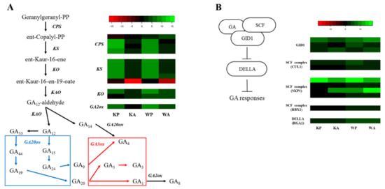 Figure 3 showed the GA hormone metabolism and the expression patterns of related genes in our RNA-seq data. Huang et al. [33] reported the identification and chromosomal location of genes related to GA hormone metabolism in wheat using ‘Chinese Spring’ nulli-tetrasomic lines. They isolated three TaCPS genes localized on chromosomes 7A, 7B, and 7D and three TaKS genes localized on chromosomes 2A, 2B, and 2D. DNA gel blotting using HvCPSL1 probe showed strong hybridization bands on chromosome group 7 and weak hybridization bands on chromosome group 2 of wheat [34]. Gibberellins have several forms of bio-active and bio-inactive (or precursors) such as GA1 and GA8, respectively. In our raw data there were GA20ox and GA3ox that convert bio-inactive GA19 to GA20 and bio-active GA1 from bio-inactive GA20, respectively, but these were not selected in analysis due to the gene selection criteria, unfortunately. GA20ox was down-regulated in ‘Keumgang’ (KP and KA) and up-regulated in WA and the contents of GA20 were lower in ‘Keumgang’ than ‘Woori’ (Figure 3). GA3ox showed no different expression between cultivars except PHS treated samples (higher in KP with RPKM ratio 2.362).