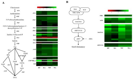 Heat map analysis of DEGs from PHS and ABA treatment for indole-3-acetic acid (IAA) hormone metabolism and signaling: (A) hormone metabolism pathway of IAA and comparative expression of genes related to IAA hormone metabolism; (B) signaling pathway of IAA and comparative expression of genes related to IAA signaling. The heatmap shows an expression change compared to the controls for each cultivar, with log2 fold-change values.