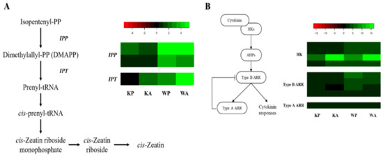 Based on our RNA-seq data, two enzymes (IPP and IPT) related to cytokinin hormone metabolism were identified (Figure 5A). One of IPTs, Traes_1BL_5C0E7A70E.1, was up-regulated in all samples while the other one, Traes_2BS_8FF7A4DD7.1, was differentially up-regulated in WP and WA (Table S12). Three enzymes (HK, Type B ARR, and Type A ARR) were identified as associated protein for cytokinin signaling (Figure 5B). All the unigenes involved in the cytokinin signaling were up-regulated in all samples except one Type B ARR (Traes_4DL_2527CA8BF.1) in KA (RPKM ratio = 0.887).