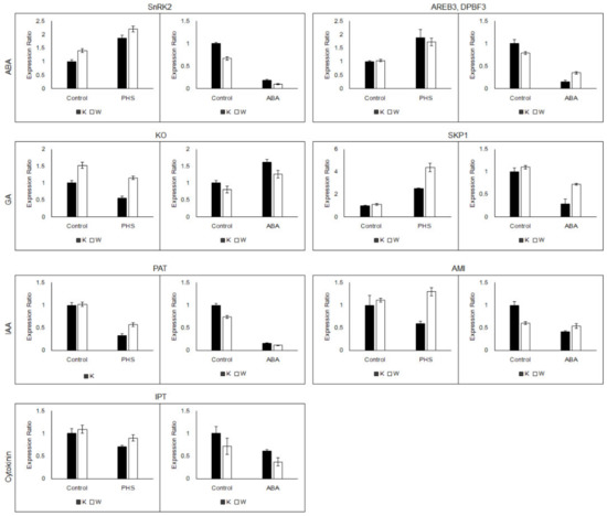 The other hormones, IAA and cytokinin, are known to regulate seed dormancy and germination via interactions with ABA. IAA interacts with ABA and ABI3. With high IAA content, ARF10/16 is activated and ABI3 is expressed to maintain seed dormancy [19,40], and PHS-tolerant cultivar ‘Woori’ showed up-regulation in all genes encoding ABI3 and ARF10/16, whereas 60% of the genes were up-regulated in ‘Keumgang’. Wang et al. [41] proposed that cytokinin regulates germination via interactions between cytokinin signaling and ABA, so that the Type A ARR represses ABI5, promoting germination. Although expression of Type A ARR showed higher up-regulation in ‘Woori’ than in ‘Keumgang,’ expression of all three ABI5 was up-regulated in WP and down-regulated in KP. All the transcriptome analysis results of phytohormone hormone metabolism and signaling suggest that GA, IAA, and cytokinin may play a subordinate role to ABA in terms of dormancy and germination and ABA is the primary regulator of dormancy and inhibition of germination.