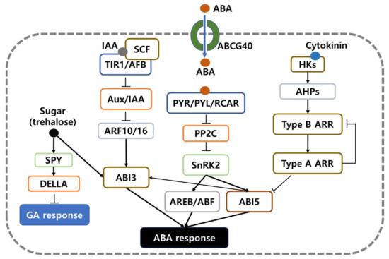 Hormonal regulation is a primary mechanism of seed dormancy and germination in seed plants. Previous studies indicated that germination is regulated by phytohormones including abscisic acid (ABA) and gibberellic acid (GA). ABA and GA are key regulators of dormancy maintenance and release, respectively, with antagonistic functions [8,9,10]. Liu et al. [11] investigated the expressions of ABA, GA, jasmonic acid (JA), and IAA (indole-3-acetic acid) related genes in after-ripened wheat seeds using microarray. Seed ABA levels are regulated by balanced biosynthetic and catabolic pathways [12,13]. Genes encoding key enzymes in ABA metabolism and catabolism have been intensively studied in dormant and dormancy-released seeds [14,15]. GA breaks dormancy and promotes germination. Typically, GA levels increase and ABA levels decrease in imbibed non-dormant seeds. Light and GA promote the degradation of ABA and the expression of the GA hormone metabolism gene increase [16]. Other phytohormones, such as auxin and cytokinin, e also associated with seed dormancy and germination. Auxin, which plays an important role in regulating plant growth and development [17,18], regulates seed dormancy via an interaction with ABA signaling and ABI3 activation [19]. Crosstalk with cytokinin, a phytohormone that affects various plant developmental processes, has been thoroughly reviewed by El-Showk et al. [20].