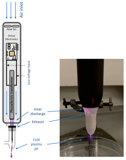 In this study, a handheld CAP system Piezobrush® PZ2 (Relyon Plasma, Regensburg, Germany), which uses a piezoelectric direct discharge (PDD®) technology, was employed. This technology is based on the direct electrical discharge of a piezo-ceramic transformer (PZT) into a working gas (air) to transform a low input voltage into high electric field forces. Specifically, the PZT with a voltage transformation ratio of more than 1000 can achieve high output voltage at low input voltage. The input voltage of DC power was 15 V and at a frequency of 50 kHz. In this study, a multigas nozzle with an inner electrode formed as a needle, as shown in Figure 1, was used. The inducer gas used was ambient air, which was fed into the CAP system by an internal axial fan, producing a corona-like plasma jet [22].