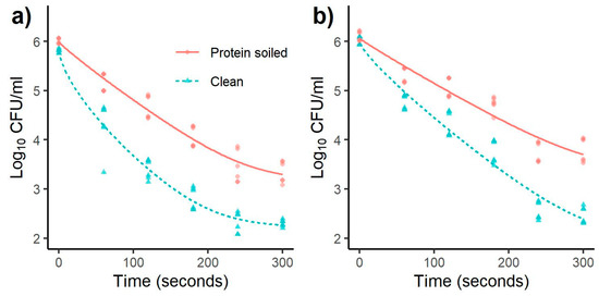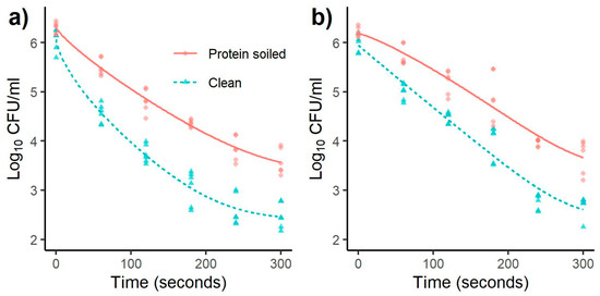 Separate inactivation curves were fitted for each combination of the treatment types, that is, for the two bacteria (L. monocytogenes and Salmonella), the distances from the plasma source (10 or 20 mm), and the cleanliness of the steel (clean or protein-soiled). For each treatment combination, the final concentration at the end of the study period (i.e., after 300 s) was predicted under both models (Equations (1) and (2), respectively) to enable the log reduction to be calculated. Parameter estimates and the log reduction achieved during the study period were compared between the treatments.