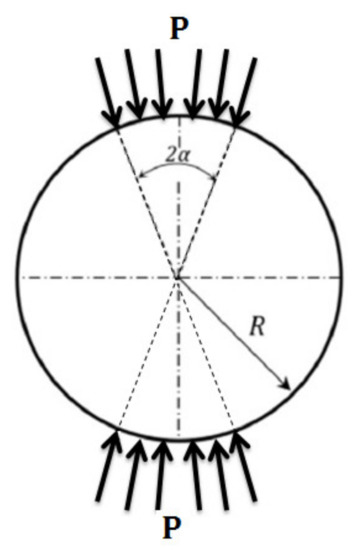 The normal stress component to the loading diameter, , and the component along the loading diameter, , are given by the analytical complete solution by Hondros (1959) [25], by the following expressions: