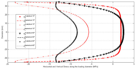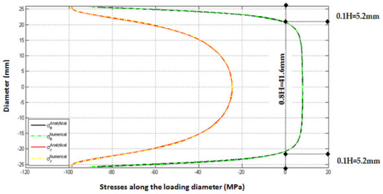 From Figure 2, it is clear that the proposed numerical and analytical methods lead to the same values of the stresses around the loading diameter. For the normal stress , a maximum relative difference between analytical and numerical solutions is 6.37%. However, a maximum deviation equal to 3.63% is marked between analytical and numerical stress along the loading diameter, .