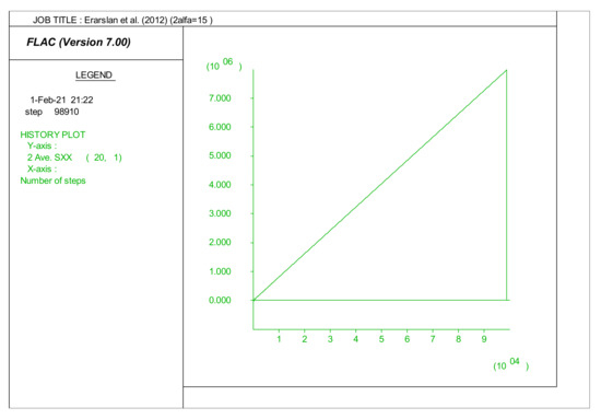 To confirm the good agreement of our numerical model, a comparison was made between stresses estimated numerically and those obtained by analytical equations (Equations (1) and (2)). Thus, before few steps prior to initiation failure, the numerical values for and through the specimen of Brisbane tuff tested by Erarslan et al. [6] in the case of arch loading angle 2α = 15°, obtained numerically and analytically [25] (Equations (1) and (2)), are shown in Figure 2 for comparison purposes.
