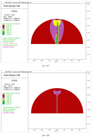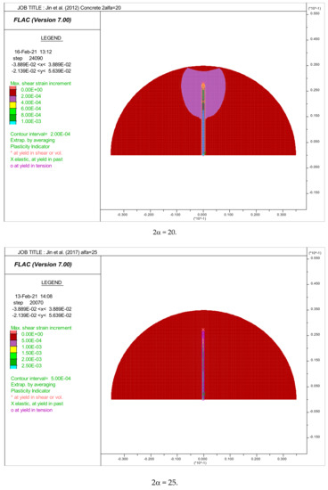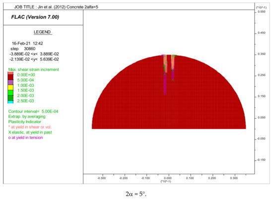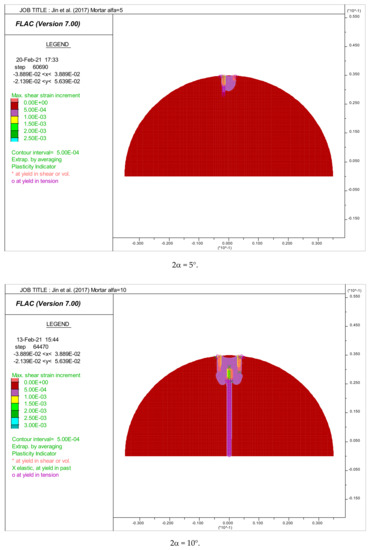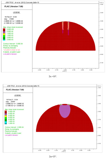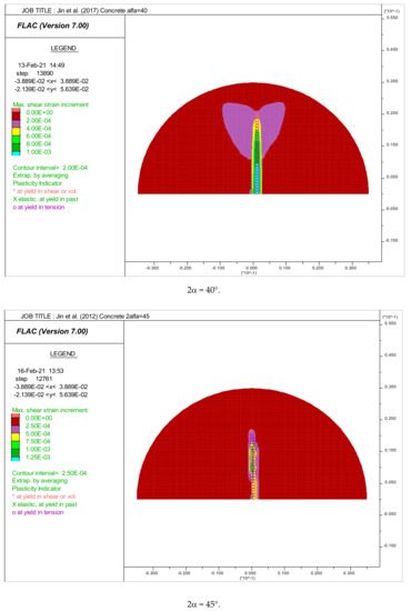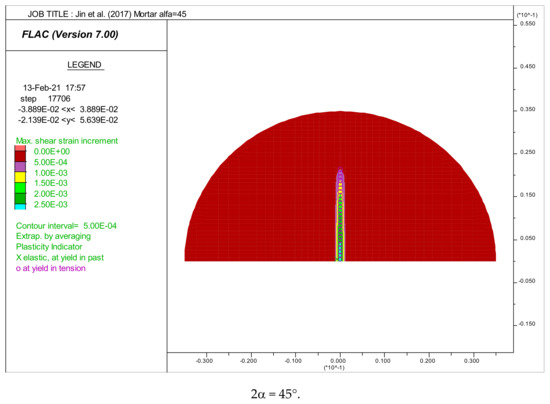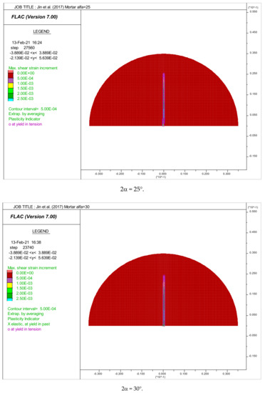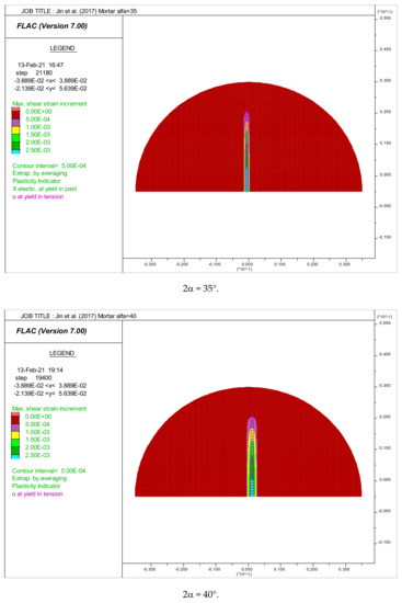 After a few steps of the elastic phase, the plastic phase is initiated (after the first crack initiation). The failure is brutal and qualified a brittle failure. As indicated by Erarslan et al. [6], a crack initiation from the center of the disk for the different cases of arch loading angles 15°, 20°, and 30°, respectively (Figure 5), has been observed. The obtained numerical result is in good agreement with the observation made by Erarslan et al. [6], proving that the suggested numerical method, herein, effectively simulates the indirect test in its different configurations.