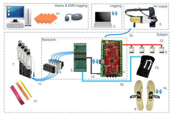 Overview of the system components and layout for the “XoSoft Gamma prototype”. The following components form the experimental platform: (1) Xsens and BTS-EMG logging for motion tracking sensors and EMG recording; (2) Logging controller for the exoskeleton state measurement sensors; (3) Air supply; (4) Central processor; (5) Valve controller board; (6) Valves; (7) Soft Clutches (SCs); (8) Shoe sensors; (9) IMUs; (10) Compressed air; (11) Vacuum lines; (12) CAN bus 1; (13) CAN bus 2; (14) Wi-Fi network 1; (15) soft sensors; (16) CAN bus 3; (17) Elastic Bands (EBs). Main hardware components of the exoskeleton are described in Section 2.2.1.