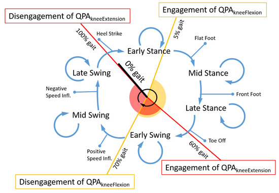 To control the QPA and the XoSoft exosuit, the main information required is the gait phase, since the clutches have two states (engaged and disengaged) that typically occur once per cycle. Consequently, the core of the control system can be a state machine that keeps track of the gait of the user. The gait cycle (time between two consecutive hell-ground contacts, heel strikes, of the same lower limb) consists in two main phases: (i) stance phase, that is the time between the heel strike of the foot and the toe off (from 0% to about 60%); and (ii) swing phase, time between the toe off and its consecutive heel strike (from about 60% to 100%). The transition between these phases is marked by the heel-strike and by the toe-off respectively. This of course, would not occur in space. To further refine this segmentation of the gait cycle, it is common to consider up to six events [90]. By fusing the sensor outputs from the ground contacts and knee angles, in real-time, the system segments the gait cycle to identify different events such as: heel strike (HS), flat foot (FlF), front foot (FrF), toe off (TO), positive speed inflection (PSI) and negative speed inflection (NSI). Using sensory data and sequencing, the specific control signals can be applied to provide the required assistance and actuator action. Once the gait has been segmented, it is possible to program the engagement and disengagement of the clutches by selecting the gait cycle percentage. The control strategy for the XoSoft exosuit can be selected based on the required resistance to be provided to the specific muscle and task. Figure 3 shows a gait cycle, corresponding segmentation and engage/disengage events. Key events during this cycle include: the interval during which the front knee actuation is engaged (), which generates a resistive torque at the knee during flexion, and the rear knee actuation () phase, which generates resistance at the knee joint during extension. is actuated between the and of the gait cycle, while () is operational between the and of the gait cycle. The choice of these particular values is due to the angular displacement that the knee covers during walking. In particular, the maximum value of the knee angle is reached at mid swing (as shown in Section 3.2.3) and since the EB elongation is a function of the joint angle, the initial or final engagement instants of both actuators are aligned with the mid swing point.
