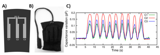 Soft sensors: The prototype used for this proof of concept integrates sensorized soft modules to measure angular displacement at the knees using soft capacitive strain sensors [91]. A three-electrode configuration incorporating micro-coaxial cables was used to shield the sensors from proximity effects and avoid parasitic capacitances. Conductive textiles and non-conductive silicone elastomers were used, because of their excellent mechanical properties in terms of stretchability, flexibility and compliance. They also bond effectively in the multilayer three-electrode structure, while providing conformability to the garment in which they are integrated. The electrodes are made from Electrolycra (Mindsets Online, Middlesex University, London, UK) a stretchable conductive textile made from silver plated nylon and elastic fibres. Ecoflex® silicone elastomer (Ecoflex 00-10, Smooth-On Inc., Macungie, PA, USA) was selected for the dielectric layers of the shielded capacitor. To provide data on the knee bending movements, three strain sensors were embedded in a commercial elastic knee brace (shown in Figure 4A,B [91]). They are rectangular in shape, with the longest side parallel to the sagittal axis, since the largest strain occurs in the sagittal axis direction. More specifically, one sensor is positioned over the patella while the other two sensors are placed on either side of the kneecap. Each sensor has an active sensing area of 162 mm2. Since these capacitive elements are also sensitive to applied pressure, the integration of three sensors allows the simultaneous discrimination between strain (due to the bending of the knee) and pressure (due to accidental contact of one sensor with the surroundings). During usage the kneepad is worn in contact with the skin, under the exosuit, to directly measure the strain induced by the bending of the knee. A typical raw output during normal walking is shown in Figure 4C.