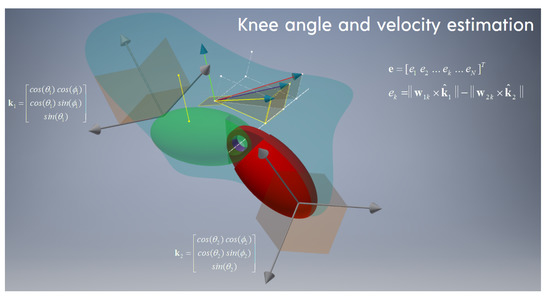Equation (4) requires knowledge of the local coordinates of the k1 and k2 vectors. Then, the spheroidal coordinates of these vectors (k1, k2) are computed using Newton’s method which minimizes the error vector [95]. Vectors k1 and k2 (with unitary modules), expressed using spheroidal coordinates, can be iteratively computed using Newton’s method to minimize the error vector. This method used to estimate the relative angle between two IMUs is known Least Square method (LSQ). A significant problem with integration, however, is that inaccuracies inherent in the measurements quickly accumulate and rapidly degrade the accuracy [96]. To improve the knee angle tracking, the algorithm incorporates: sensor random drift models, prior knowledge of the physical constraints and human natural range of motion, and zero-velocity updates. This gives better joint angle estimates and mitigates the effect of sensor drift on the estimated heading angles during long periods of movement. Due to the difficulties, for the LSQ method, to mitigate with a running calibration phase the drift, biases and noise, an extended Kalman filter (EKF) based method is required. Although the development of the EKF is beyond the scope of this work, the main equations are reported for completeness. The nonlinear state-space discrete form representation of the process and measurement models are expressed by