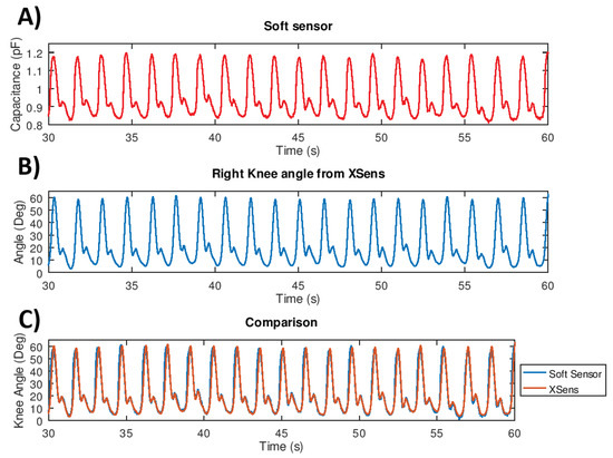 (A) Soft sensor output. (B) Knee angle measured by the XSens system. (C) Comparison between soft sensors (blue solid line) and XSens system (red solid line), using a linear combination for fitting the knee angle.