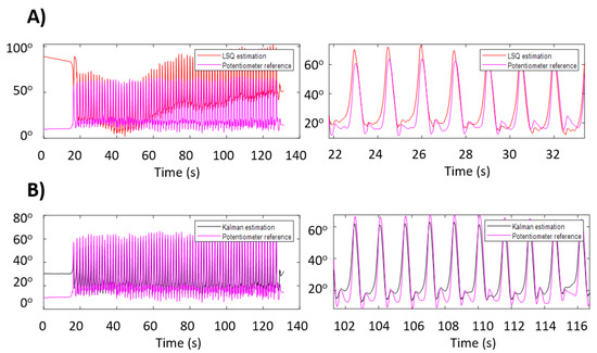 Knee rotation angle by means of the LSQ algorithm (A) and Extended Kalman filter algorithm (B) using the IMUs located on the leg with parallel orientations.
