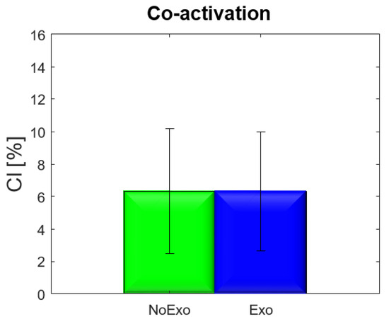 Mean (bars’ height) and standard deviation (vertical whiskers) of the co-activation index without and with the exoskeleton. The horizontal line with the asterisk denotes a statistically significant difference.