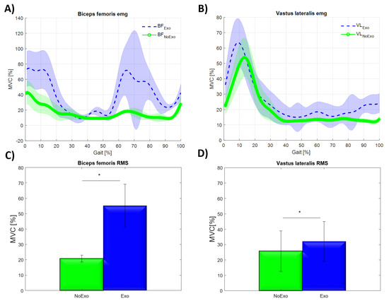 (A) Biceps femoris activation with and without XoSoft. (B) Vastus lateralis activation with and without XoSoft. (C) Biceps femoris RMS mean (bars’ height), standard deviation (vertical whiskers) with and without the exoskeleton. (D) Vastus lateralis RMS mean (bars’ height), standard deviation (vertical whiskers) with and without the exoskeleton. Both in panels (C,D), the horizontal line with the asterisk denotes a statistically significant difference.