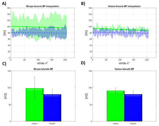 (A) Biceps femoris MF interpolation with and without XoSoft. (B) Vastus lateralis MF interpolation with and without XoSoft. (C) Biceps femoris MF mean (bars’ height), standard deviation (vertical whiskers) with and without the exoskeleton. (D) Vastus lateralis MF mean (bars’ height), standard deviation (vertical whiskers) with and without the exoskeleton. Both in panels (C,D) the horizontal line with the asterisk denotes a statistically significant difference.