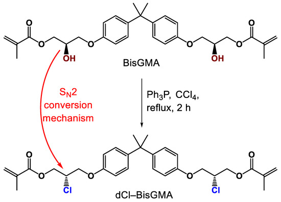 The monomeric materials BisGMA (>98%), TEGDMA (>95%), and UDMA (>97%), as well as the photoinitiator camphorquinone (CQ; 97%), the curing accelerator 2-(N,N-dimethylamino)ethyl methacrylate (DMAEMA; 98%), the coupling agent γ-methacryloxypropyltrimethoxysilane (γ-MPS; 98%), and the chlorine source carbon tetrachloride (CCl4; >99.8%), were purchased from Sigma–Aldrich (Taufkirchen, Germany). Appel reaction catalyst triphenylphosphine (Ph3P; >98%) was obtained from Cica-Reagent (Kanto Chemical, Tokyo, Japan). The solvents n-hexane (n-H; >97%), ethyl acetate (EA; 99%), and dichloromethane (DCM; 99.6%) were procured by Fisher Scientific (Loughborough, UK). Th model filler Aerosil-200 fumed silica (A200) was purchased from Evonik (Evonik Industries, Essen, Germany) and was modified with γ-MPS. All chemicals were used as received unless stated otherwise.