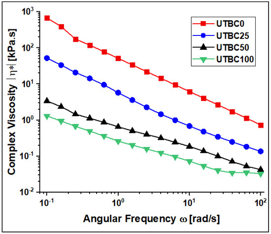 The complex viscosity (η*) of the UTBC resin composites at 25 °C.