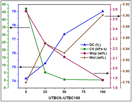 Degree of conversion (DC), complex viscosity (CV) at 1.0 rad/s angular frequency, water uptake (WSP), and water solubility (WSL) of the first cycle of sorption–-desorption versus the dCl-BisGMA amount in the investigated composites (UTBC0, UTBC25, UTBC50, and UTBC100).