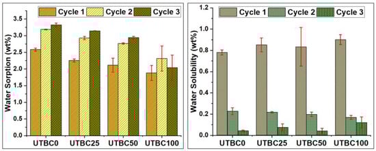 Water upatake and water solubility of UTBC0–UTBC100 after three cycles of sorption–desorption processes.
