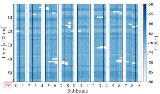 Each successive trace of roughly 1 s measured by the FSV was post-processed such that the samples were aligned with the 5G NR frame structure and stacked per SSB period of 20 ms (‘waterfall diagram’ [13]). This post-processing step, which is illustrated in Figure 4, enables one to distinguish between the SSB (which is four Orthogonal Frequency Duplexing Multiplexing (OFDM) symbols long) and the PDSCH resources. In this case, there was only one cell-wide SSB, i.e., the narrow band with a length of four symbols within the first of two slots of the first subframe ‘0’ (on the far left of Figure 4). The PDSCH-allocated symbols, on the other hand, form multiple thicker bands each consisting of four successive slots, with 10 (in the case of a special ‘S’ slot) or 14 symbols (a normal downlink ‘D’ slot). The varying color and sometimes gaps in Figure 4 further illustrate the varying allocation of PDSCH resources within the measured bandwidth. Furthermore, from Figure 4 the TDD pattern ‘DDDSU’ can be observed (where an ‘S’-slot contains 10 downlink symbols) and a TDD factor of 0.74 is obtained.