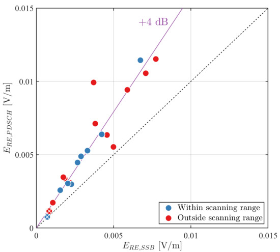 Scatterplot of the electric-field strength per resource element for the Physical Downlink Shared Channel (PDSCH) signals versus the of the SSB signals at each measurement location. The locations were grouped by their relative position to the NR base station: within (blue dots) or outside its scanning range (red dots). Markers with a white X depict positions in non-line-of-sight. The purple line depicts a +4 dB difference between and .