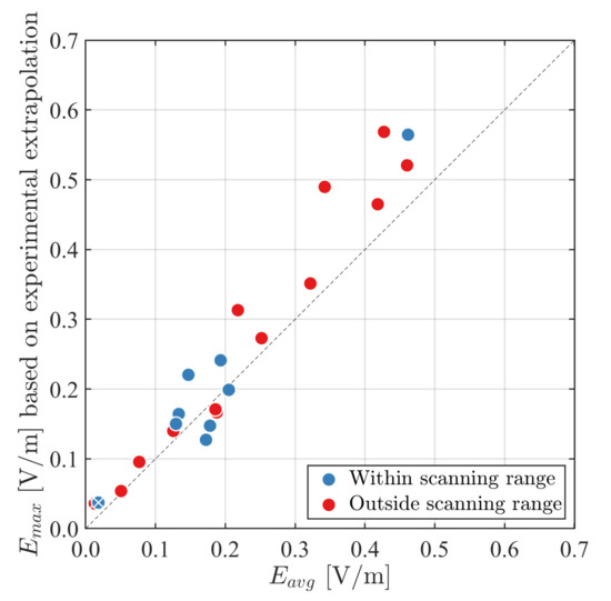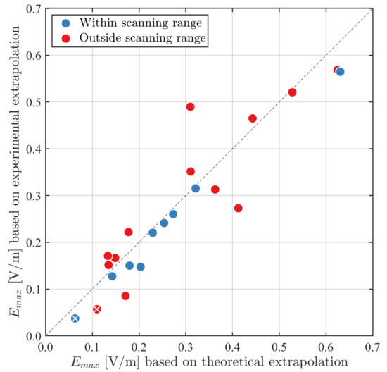 Scatterplot of the maximum electric-field strength , using the experimental extrapolation—based on the direct measurement of (Equation (2))—versus the theoretical extrapolation—based on the difference in antenna gain, derived from the antenna patterns (Equation (1)). The locations were grouped by their relative position to the NR base station: within (blue dots) or outside its scanning range (red dots). Markers with a white X depict positions in non-line-of-sight.