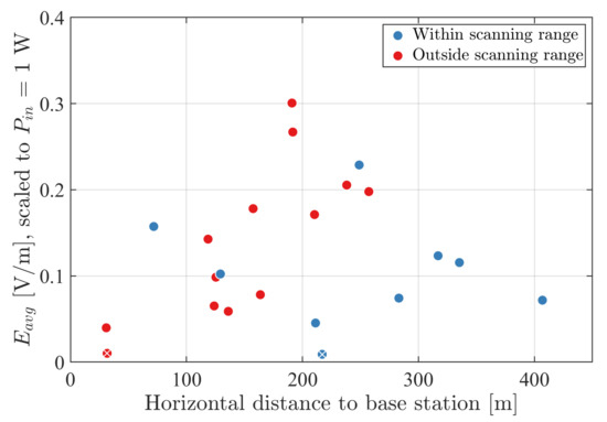 Average electric-field strength , measured during 100% downlink traffic directed towards the user equipment (UE), normalized to an antenna input power of 1 W, as a function of the horizontal distance to the NR base station. The locations were grouped by their relative position to the NR base station: within (blue dots) or outside its scanning range (red dots). Markers with a white X depict positions in non-line-of-sight.