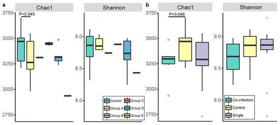 Two alpha diversity measures Chao1 and Shannon’s diversity index. Community diversity represented by Chao1 and Shannon diversity index for samples from each group. Each dot stands for a discrete individual while each color represents (a) the samples from the camels infected with different parasites, (b) the samples from the camels with non-, single-, co-infection with parasites as the label showed.