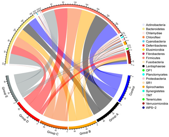 We analyzed the bacterial community composition at the phylum level across the six groups (Figure 2). The circlize plot represented the average relative abundance of each bacterial taxon. In all six groups, Firmicutes was the dominant phylum, as 52.49%, 56.62%, 54.69%, 54.52%, 49.33%, and 44.51% in the control, A, B, C, D, and E groups, respectively. The secondly abundant phylum was Bacteroidetes (33.18%, 30.71%, 32.31%, 35.39%, 32.63%, and 38.51%) in these six groups, respectively. In addition, the phyla Chlamydiae, SR1 and WPS-2 were present only in the Control, A, and E groups, but absent in the B, C, and D groups. OP1 was scarcely found in the Control and A groups. Fusobacteria was absent in group E, while Deferribacteres and Synergistetes were undetected in group B. Moreover, the biggest differences among the 6 groups of phyla were Verrucomicrobia and Spirochaete.