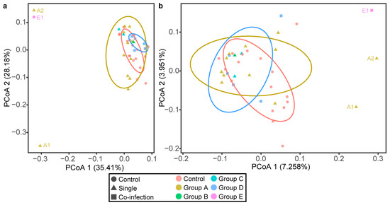 Principal Coordinate Analysis (PCoA) with weighted/unweighted UniFrac distance analysis. PCoA plot of (a) the weighted UniFrac distances, (b) the unweighted UniFrac distances of fecal microbiota from each Bactrian camel. Control means negative samples of parasites, Single means samples infected with one of Cryptosporidium spp., E. bieneusi., and G. duodenalis., Co-infection means samples infected with more than one parasite. As the label shows, exactly infection and indiscriminate positive samples are differentiated by colors and shapes (circle, triangle, and square, respectively).