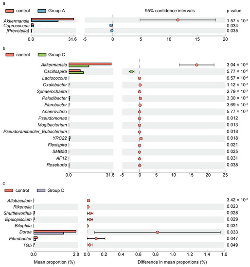 At the genus level, we observed significant differences in microbiota composition between control and Groups A, C, and D (Figure 4). In Group A, Coprococcus (p = 0.034) and Prevotella (p = 0.035) were more abundant, while Akkermansia (p < 0.01) showed a significantly lower relative abundance than that in the control group (Figure 4a). In comparison with the control group, Group C showed more abundant Oscillospira (p < 0.01), and less abundant Akkermansia (p < 0.01), Lactococcus (p < 0.01), Oxalobacter (p < 0.01), Sphaerochaeta (p < 0.01), Paludibacter (p < 0.01), Fibrobacter (p < 0.01), Anaerovibrio (p < 0.01), Pseudomonas (p = 0.012), Mogibacterium (p = 0.013), Pseudoramibacter_Eubacterium (p = 0.018), YRC22 (p = 0.018), Flexispira (p = 0.021), SMB53 (p = 0.025), AF12 (p = 0.031), and Roseburia (p = 0.038) (Figure 4b). For Group D, lower relative abundances were observed in Allobaculum (p < 0.01), Rikenella (p = 0.023), Shuttleworthia (p = 0.028), Epulopiscium (p = 0.029), Bilophila (p = 0.031), Dorea (p = 0.033), Fibrobacter (p = 0.047), and TG5 (p = 0.049) compared to the control group. Samples of Group B and E were not analyzed for the relative abundance due to the limited sample size.