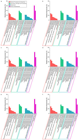 The relative frequencies of matched reads assigned in cluster orthologous groups (COGs) in camel feces. Four function categories in COG are showed here; (a–f) represent for the relative frequencies of control, Group A, Group B, Group C, Group D, Group E, Group F, respectively.