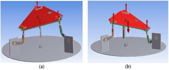 In this study, to consider tester safety and supporting a weight of ~400 kg, a platform stress simulation was carried out to verify the stress at a material safety factor (N = 2). In this study, the material S45C was used. The stress simulation can be divided into roll and pitch motion. Both of the roll and pitch motion were loaded with the downward force at the center point and set an upward support force at the three end points of the triangle at the same time to analyze the structural strength. The simulation model was schematically shown in Figure 4a,b.