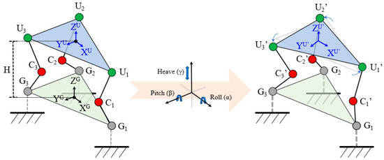 Both the motor output platform and the upper platform were designed as equilateral triangles: the length of the motor output platform assumes , the length of the upper platform assumes , and the distance H from the center of mass of the upper platform to the motor output platform were assumed. The upper platform coordinate after movement can be converted by the Euler angle transformation matrix. It was assumed that the coordinate was the coordinate turning angle to the axis and turning angle to the axis as shown in Equation (3). Moreover, was shifted by h as shown in Equation (4). Then, the relationship of coordinate and coordinate was described by Equation (5). The distance from the center of mass to the three vertices was kept in the coordinate . The three vectors of the coordinate could be superimposed to obtain the vector of the coordinate and the final movement position .