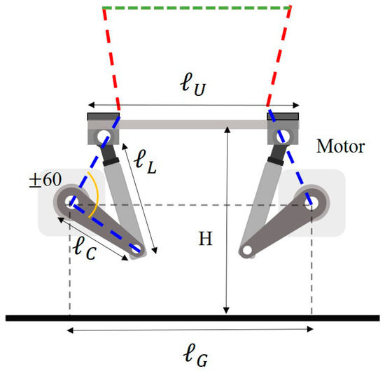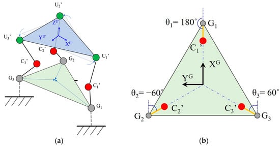 After obtaining the position of the upper platform, the position of the crank connecting rod joint could be further derived. Assuming the position , position , crank length , and the connecting rod length were a known condition. The dimension of the platform is shown in Figure 6.