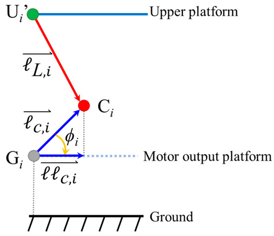 After obtaining the position , the vector of the connection point between and the upper platform was regarded as the connecting rod length and the motor output platform. The contact connection vector was regarded as the crank length and the vector relation, as shown in Equation (9). The crank length vector was projected to the motor output platform to obtain the vector , as shown in Figure 8. Finally, the motor output angle could be obtained by Equation (10).