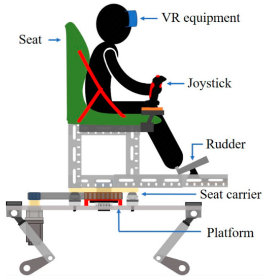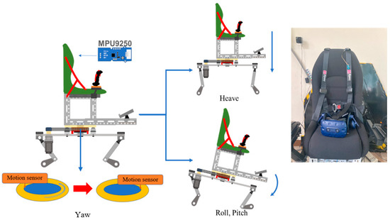 The completed platform was integrated with the flight VR image. To immerse in VR, the joystick was installed on the chair and combined with the multi-axis platform to make the experience more real. The tester sat in the middle of the platform and operated the joystick to control the VR image to perform three-axis direction and rotation. The schematic side view is shown in Figure 9.