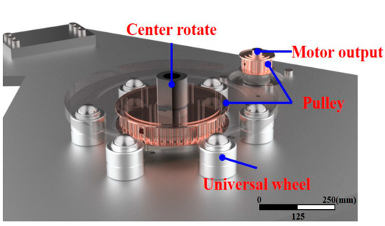 The design of the rotation mechanism was mainly by six universal wheels, pulley, and belt, as shown in Figure 12. The supporting weight of this subsystem was ~250 kg, and the required torque was calculated by Equation (2). The result showed the required torque was 188 , and the rated torque of the motor was about 2.39 . The reducer reduction ratio was 1:40. Finally, the drive was combined with the belt, and the reduction ratio was 1:120. Then, we found that the final torque was about 286.8 .