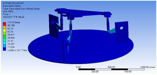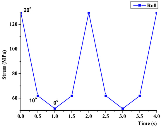 The support of the platform was input by total weight of ~400 kg in the analysis. The stress simulation was divided into roll and pitch motion. Among them, the stress of roll motion simulation was analyzed at platform motion angles of 0°, 10°, and 20°. The simulation results showed that the maximum stress was located at the angle of 20° with a maximum stress of 129.63 MPa. The maximum stress analysis result is shown in Figure 13. The roll motion stress trend is shown in Figure 14.