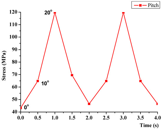 For the pitch motion, the platform motion angles were 0°, 10°, and 20°. The simulation results showed that the maximum stress was located at the angle of 20° with a maximum stress of 119.79 MPa. The maximum stress analysis result is shown in Figure 15. The pitch motion stress trend is shown in Figure 16.