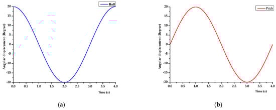 The roll and pitch motions were analyzed based on harmonic curves, and the single-cycle period of the path was 4 s. In addition, the motion angle was ±20°. The preset path of roll motion was a cosine curve, as shown in Figure 17a, and the pitch motion was a sine curve, as shown in Figure 17b.