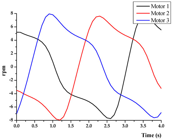 The trajectory of the crank and linkage positions of the roll and pitch motion were integrated and combined with the motor output angles of each action point to create a multi-axis motion platform trajectory model by Matlab, as shown in Figure 18. The maximum upward motor output angle was 58.3°, the maximum downward angle was 58.6°, and the total stroke angle was about 117°, as shown in Figure 19. In addition, the maximum motor output velocity was about 7.8 rpm, as shown in Figure 20.